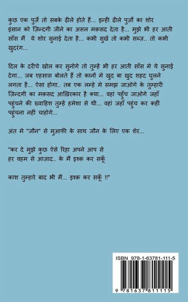 kuch ek purze ko sabke dhile hote hain... inhi dhile purzon ka shor insaan ko zindagi jeene ka asl maqsad deta hai... mujhe bhi har aati saans mai ye shor sunai deta hai... kabhi surkh to kabhi sabz... to kabhi khudrang... dil ke darcihe khol kar sunoge to tumhein bhi har aati saans mai ye shor sunai dega... jab ehsaas bolte hain to kaano.n main khud ba khud shahad ghul jaata hai... aisa hoga.. to ek lamhe mai hi samajh jaoge ke tumhari zindagi ka maqsad aakhirkar hai kya... vahan pahunch jaoge jahan pahuchne ki khwahish tumhein humesha se thi... vahan jahan pahunch kar kahin pahunchna nahi chahoge... anth mai ""jaun"" se maufi ke saath jaun ke liye ek sher... ""kar de mujhe aise rihaa kuch apne aap se har vehm se aazaad... k mai ishq kar sakun kaash tumhare baad bhi main... ishq kar sakun !!""