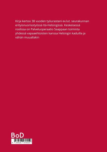 Kirja kertoo 38 vuoden työurastani ev.lut. seurakunnan erityisnuorisotyössä Itä-Helsingissä. Keskeisessä roolissa on Palveluoperaatio Saappaan toiminta yhdessä vapaaehtoisten kanssa Helsingin kaduilla ja vähän muuallakin