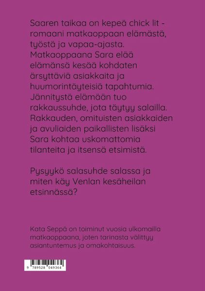 Saaren taikaa on kepeä kertomus matkaoppaan elämästä, työstä ja vapaa-ajasta. Kirjassa avataan matkaoppaan työtä Saarella eikä asiakaskohtaamisista puutu huumoria. Jännitystä puolestaan tuo rakkaussuhde, jota täytyy salailla. Rakkauden, omituisten asiakkaiden ja kulttuurishokin lisäksi Sara kohtaa huumorin täyteisiä tilanteita ja itsensä etsimistä. Pysyykö suhde salassa ja miten käy Venlan kesäheilan etsinnässä?