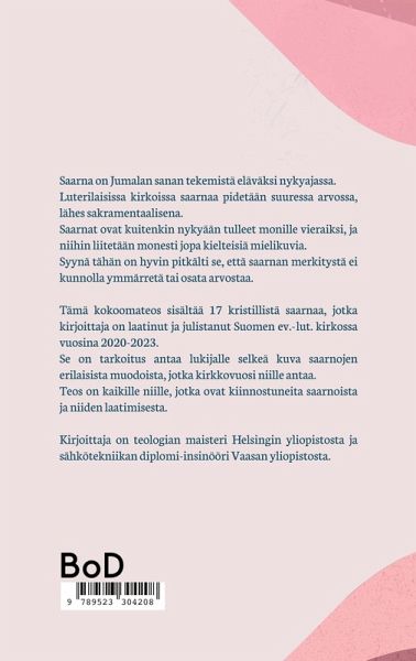 Saarna on Jumalan sanan tekemistä eläväksi nykyajassa. Luterilaisissa kirkoissa saarnaa pidetään suuressa arvossa, lähes sakramentaalisena. Saarnat ovat kuitenkin nykyään tulleet monille vieraiksi, ja niihin liitetään monesti jopa kielteisiä mielikuvia. Syynä tähän on hyvin pitkälti se, että saarnan merkitystä ei kunnolla ymmärretä tai osata arvostaa. Tämä kokoomateos sisältää 17 kristillistä saarnaa, jotka kirjoittaja on laatinut ja julistanut Suomen ev.-lut. kirkossa vuosina 2020-2023. Se on tarkoitus antaa lukijalle selkeä kuva saarnojen erilaisista muodoista, jotka kirkkovuosi niille antaa. Teos on kaikille niille, jotka ovat kiinnostuneita saarnoista ja niiden laatimisesta. Kirjoittaja on teologian maisteri Helsingin yliopistosta ja sähkötekniikan diplomi-insinööri Vaasan yliopistosta.