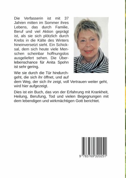 Die Verfasserin ist mit 37 Jahren mitten im Sommer ihres Lebens, das durch Familie, Beruf und viel Aktion geprägt ist, als sie sich plötzlich durch Krebs in die Kälte des Winters hineinversetzt sieht. Ein Schicksal, dem sich heute viele Menschen scheinbar hoffnungslos ausgeliefert sehen. Die Überlebenschance für Anita Spohn ist sehr gering. Wie sie durch die Tür hindurchgeht, die sich ihr öffnet, und auf dem Weg, der sich ihr zeigt, voll Vertrauen weiter geht, wird hier aufgezeigt. Dies ist ein Buch, das von der Erfahrung mit Krankheit, Heilung, Berufung, Tod und vielen Begegnungen mit dem lebendigen und wirkmächtigen Gott berichtet.