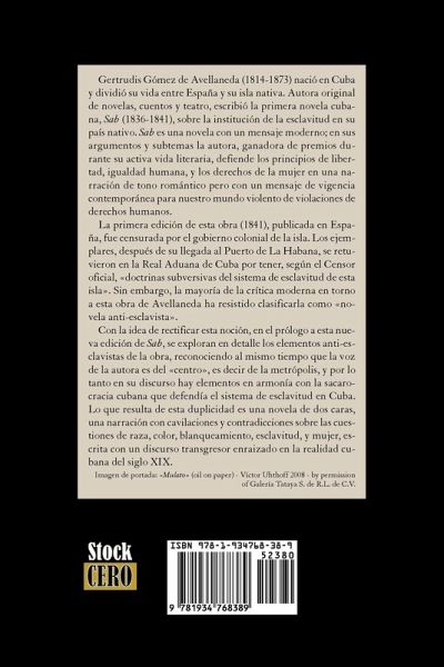 Gertrudis Gomez de Avellaneda (1814-1873) was born in Cuba and split her life between Spain and her native island. Author of original novels, short stories and drama, she wrote «Sab» (1836-1841), considered the first Cuban novel about slavery in the island. Within its plots and subplots «Sab» comprises a modern message, as Gertrudis Gomez de Avellaneda, a highly prized author during her active literary life, exposes and advocates for the principles of freedom and equal human as well as feminine rights by means of a highly romantic story, building up a message that still stands valid today, as in the contemporary world human rights are subject of violent violations every day. The novel's first edition (1841), published in Spain, suffered the island's colonial government censorship. Upon arrival to La Habana the copies were seized at the Cuba Royal Customs, the official Censor claiming that they «express doctrines subversive to the island's slavery system». However, the vast majority of the modern criticism has resisted classifying this Avellaneda writing as «anti-slavery». Aiming to rectify this conception, prof. Ivan A.Schulman's foreword to this new edition highlights the anti-slavery elements imbedded in the text, all the while accepting that the author's voice provenience is the «center», or «metropolis», thus her speech shows many aspects that can be seen to agree with the Cuban «sugar aristocracy» slavery supporting stance. The results of this duality is a two faced novel, a story full with cogitations and contradictions about race, color, «whitening», slavery and feminism, intertwined in a transgressor speech deeply rooted in the XIX Century Cuba.