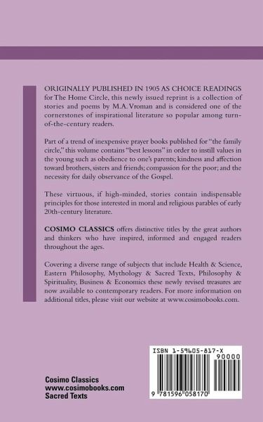 Originally published in 1905 as Choice Readings For The Home Circle, this newly issued reprint is a collection of stories and poems by M.A. Vroman and is considered one of the cornerstones of inspirational literature so popular among turn-of-the-century readers. Part of a trend of inexpensive prayer books published for "the family circle," this volume contains "best lessons" in order to instill values in the young such as obedience to one's parents; kindness and affection toward brothers, sisters and friends; compassion for the poor; and the necessity for daily observance of the Gospel. These virtuous, if high-minded, stories contain indispensable principles for those interested in moral and religious parables of early 20th-century literature.