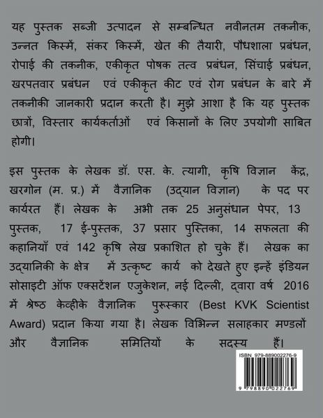 This book provides technical information about the latest technology related to vegetable production, improved varieties, hybrids, field preparation, nursery management techniques, transplanting techniques, water management, integrated nutrient management and integrated pest and disease management. I hope this book will be useful for students, extension workers and farmers Dr. S. K. Tyagi