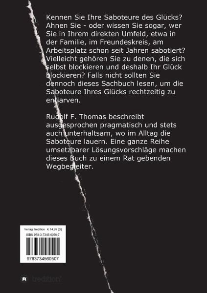 Aber es sind nicht nur die anderen, die für Sabotage sorgen. Häufig steht man seinem Glück als Saboteur in eigener Sache, ohne es zu ahnen, ein Leben lang selbst im Weg. Das Buch führt die Leser anhand der Beschreibung typischer Alltagsszenen zur Selbsterkenntnis. Vor allem zeigt es ohne psychologischen Kauderwelsch eine ganze Reihe von verständlichen und somit anwendbaren Lösungen im Umgang mit Saboteuren des Glücks auf.