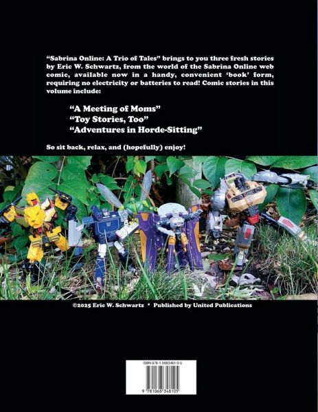 Sabrina Online: 'A Trio of Tales' brings to you three fresh stories by Eric W. Schwartz, from the world of Sabrina Online web comics, available now in a handy, convenient "Book" form, requiring no electricity or batteries to read! Comics stories in this volume include: "A Meeting of Mums", "Toy Stories, Too" and "Adventures in Horde-Sitting". Continuing over 25 years of Eric W. Schwartz cartoon madness. Following previous Sabrina Online volumes 'A Decade in Black & White', 'The Tail of Two Decades', 'Baby Steps' and 'Homecoming & Skunks Day Out' collections. Special paperback edition, 127 colour pages 8.5x11. Created, written, and drawn by Eric W. Schwartz.