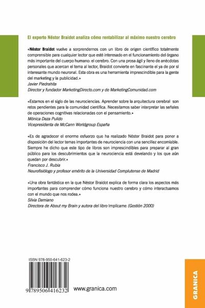 El experto Nestor Braidot analiza como rentabilizar al máximo nuestro cerebro. "Nestor Braidot vuelve a sorprendernos con un libro de origen cientifico totalmente comprensible para cualquier lector que este interesado en el funcionamiento del organo mas importante del cuerpo humano: el cerebro. Con una prosa agil y lleno de anecdotas personales que acercan el tema al lector, Braidot convierte en fascinante el ya de por si interesante mundo neuronal. Esta obra es una herramienta imprescindible para la gente del marketing y la publicidad" Javier Piedrahila - Director y fundador MarketingDirecto.com y de MarketingComunidad.com "Estamos en el siglo de las neurociencias. Aprender sobre la arquitectura cerebral son retos pendientes para la comunidad cientifica. Necesitamos saber interpretar las señales de operaciones cognitivas relacionadas con el pensamiento" Monica Deza Pulido - Vicepresidenta de McCann Worldgroup España "Es de agradecer el enorme esfuerzo que ha realizado Nestor Braidot para poner a disposición del lector temas importantes de neurociencia con una sencillez encomiable. Siempre he dicho que este tipo de libros son imprescindibles para preparar al gran publico para los descubrimientos que la nuerociencia esta desvelando y los que aun quedan por descubrir" Francisco J Rubia - Neurofisiólogo y profesor emerito de la Universidad Complutense de Madrid. "Una obra fantástica en la que Nestor Braidot explica de forma clara los aspectos mas importantes para comprender como funciona nuestro cerebro y como interactuamos con el mundo que nos rodea" Silvia Damiano - Directora de About my Brain y autora del libro Implícame (Gestión 2000)