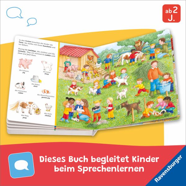 Dieses kunterbunte Bilderbuch lädt Kinder dazu ein, spielerisch erste englische Begriffe kennenzulernen. Auf 11 großen Schaubildern geht es um die Familie, die Freunde, den Kindergarten und den Spielplatz. Auch bei einer Fahrt mit dem Zug, auf der Baustelle und im Zoo bei den Tieren gibt es zahlreiche erste Begriffe auf Deutsch und Englisch zu entdecken. Unterstützt durch den beliebten "Sachen suchen"-Spieleffekt werden schon kleine Kinder neugierig mit viel Freude den Klang der fremden Sprache erforschen. So werden sie schon früh auf die Vielfalt in der Gesellschaft vorbereitet. Ein erstes bilinguales Wörterbuch für die ganze Familie.