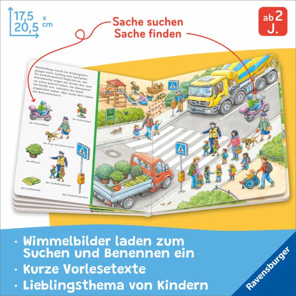 Hier gilt es vorsichtig zu sein: Denn überall wimmelt es nur so von Fahrzeugen und Menschen in der Stadt und auf den Straßen. Um auf den Spielplatz zu gehen, muss an der Ampel die Straße überquert werden und überall sind Autos, Motorräder, Fahrräder und Baufahrzeuge unterwegs. Deshalb ist heute auch im Kindergarten eine Polizistin zu Besuch, und auf dem Verkehrsübungsplatz darf mit den Kinderfahrzeugen geübt werden. Ein Wimmel-Suchbuch, dass nicht nur Spaß macht, sondern zusätzlich erste Verkehrserziehung vermittelt._ Das beliebte "Sachen suchen" Spielprinzip ist einfach, macht Spaß und bringt groß und klein zusammen.