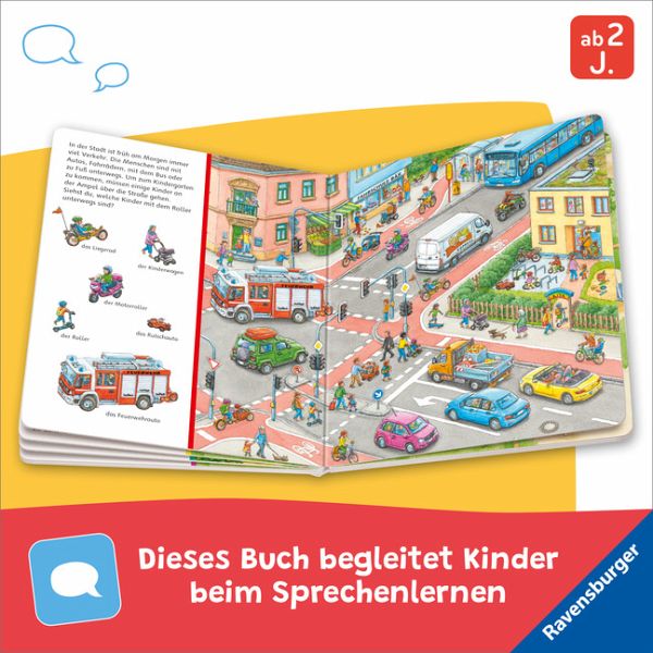 Bei Rot muss man stehen, bei Grün darf man gehen! An der Ampel ist klar was zu tun ist, aber schon am Zebrastreifen gilt es noch vorsichtiger zu sein. Zahlreiche, ganz unterschiedliche Verkehrssituationen zeigen, wie man sich im Straßenverkehr verhalten soll und bereiten schon kleine Kinder darauf vor, achtsam zu sein. Das "Sachen suchen" Spielprinzip hilft dabei, sich in Situationen hineinzudenken, macht Spaß und die Suchbegriffe erweitern den Wortschatz.