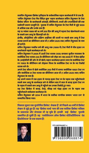 Sachin Tendulakarcricket itihaas ke sarvakaalik mahaan ballebaajon mein se ek hain. 'Sachin Tendulakar Test match kviz buk' mahaan ballebaaj Sachin Tendulakar ke Test cricket jeevan ke ballebaajee aankadon, keertimaanon, tathyon aur upalabdhiyon kee ek prashnottaree praaroop prastuti hai. Pustak mein Sachin Tendulakar ke Test maichon se jude 1000 se adhik prashn aur unake uttar hain. vah 15 november 1989 ko 16 varsh 205 din ki aayu mein Test khelanevaale bhaarat ke sabase kam aayu ke khilaadee bane the. England, Australia aur dakshin afreeka kee dharatee par sabase kam aayu mein Test shatak banaane ka keertimaan aaj bhee (1 April 2025 tak) Sachin Tendulakar ke naam hee darj hai. Sachin Tendulakar 25 varsh kee aayu tak test maichon mein paanch hazaar run banaanevaale pahale ballebaaz bane the. Sachin Tendulakar ne 2005 mein 35vaan Test shatak (109) banaakar Sunil Gavaskar ke sarvaadhik Test shatak (34) ke keertimaan ko toda tha. Vah 2008 mein mahaan ballebaaz Brian Lara (West Indies/ICC) ke sarvaadhik Test run 11953 ke keertimaan ko todakar sarvaadhik Test run ke nae record dhaarak bane the. Sachin Tendulakar ka sarvaadhik 200 Test maichon mein banae sarvaadhik 15921 Test run aur sarvaadhik 51 Test shatak ka keertimaan 1 April 2025 tak kaayam hai. Vah Test cricket mein 12,13, 14 aur 15 hazaar run banaanevaale sarvapratham ballebaaz the. Sachin Tendulakar ko 2014 mein bhaarat ke sarvochch naagarik sammaan 'Bhaarat Ratna' se sammaanit kiya gaya.