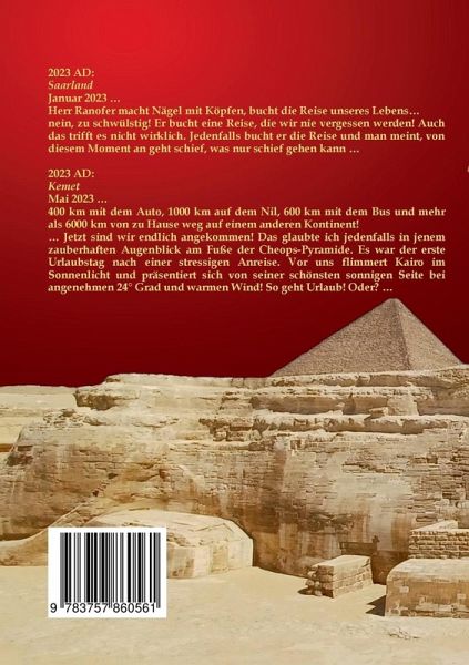 2023 AD: SaarlandJanuar 2023 ... Herr Ranofer macht Nägel mit Köpfen, bucht die Reise unseres Lebens... nein, zu schwülstig! Er bucht eine Reise, die wir nie vergessen werden! Auch das trifft es nicht wirklich. Jedenfalls bucht er die Reise und man meint, von diesem Moment an geht schief, was nur schief gehen kann ...2023 AD: KemetMai 2023 ...400 km mit dem Auto, 1000 km auf dem Nil, 600 km mit dem Bus und mehr als 6000 km von zu Hause weg auf einem anderen Kontinent! ... Jetzt sind wir endlich angekommen! Das glaubte ich jedenfalls in jenem zauberhaften Augenblick am Fuße der Cheops-Pyramide. Es war der erste Urlaubstag nach einer stressigen Anreise. Vor uns flimmert Kairo im Sonnenlicht und präsentiert sich von seiner schönsten sonnigen Seite bei angenehmen 24° Grad und warmen Wind! So geht Urlaub! Oder? ...