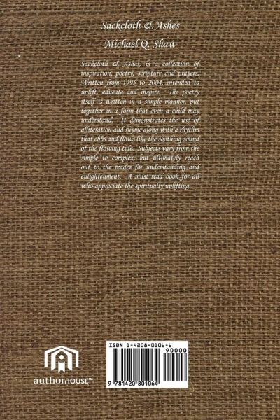 Sackcloth & Ashes, is a collection of inspiration, poetry, scripture and prayers. Written from 1995 to 2004, intended to uplift, educate and inspire. The poetry itself is written in a simple manner, put together in a form that even a child may understand. It demonstrates the use of alliteration and rhyme along with a rhythm that ebbs and flows like the soothing sound of the flowing tide. Subjects vary from the simple to complex, but ultimately reach out to the reader for understanding and enlightenment. A must read book for all who appreciate the spiritually uplifting.