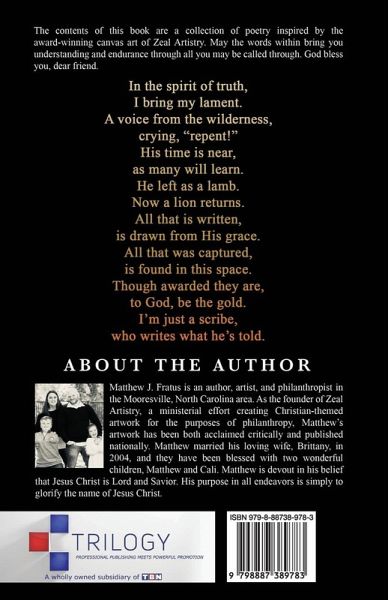 The contents of this book are a collection of poetry inspired by the award-winning canvas art of Zeal Artistry. May the words within bring you understanding and endurance through all you may be called through. God bless you, dear friend. In the spirit of truth, I bring my lament. A voice from the wilderness, crying, "repent!" His time is near, as many will learn. He left as a lamb. Now a lion returns. All that is written, is drawn from His grace. All that was captured, is found in this space. Though awarded they are, to God, be the gold. I'm just a scribe, who writes what he's told.