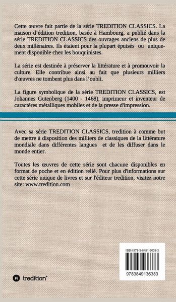 Cette uvre (édition relié) fait partie de la série TREDITION CLASSICS. La maison d édition tredition, basée à Hambourg, a publié dans la série TREDITION CLASSICS des ouvrages anciens de plus de deux millénaires. Ils étaient pour la plupart épuisés ou uniquement disponible chez les bouquinistes. La série est destinée à préserver la littérature et à promouvoir la culture. Avec sa série TREDITION CLASSICS, tredition à comme but de mettre à disposition des milliers de classiques de la littérature mondiale dans différentes langues et de les diffuser dans le monde entier.