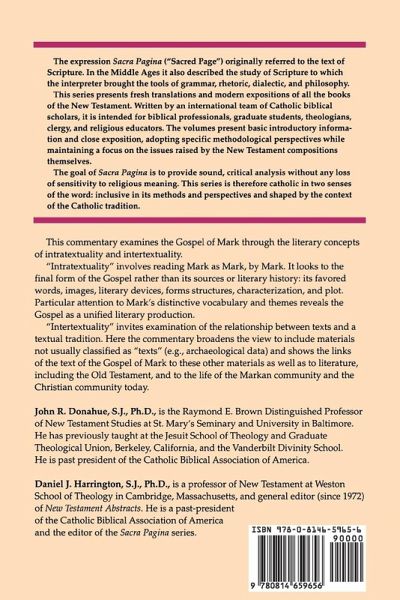 In The Gospel of Mark Fathers Donahue and Harrington use an approach that can be expressed by two terms currently used in literary criticism: intratextuality and intertextuality. This intratextual and intertextual reading of Mark's Gospel helps us to appreciate the literary character, its setting in life, and its distinctive approaches to the Old Testament, Jesus, and early Christian theology. "Intratextuality" means we read Mark as Mark and by Mark. Such a reading expresses interest in the final form of the Gospel (not its source or literary history) and in its words and images, literary devices, literary forms, structures, characterization, and plot. Reading Mark by Mark gives particular attention to the distinctive vocabulary and themes that run throughout the Gospel and serve to hold it together as a unified literary production. "Intertextuality" comprises the relation between texts and a textual tradition, and also referring to contextual materials not usually classified as texts (e.g., archaeological data). "Intertextuality" is used to note the links of the text of Mark's Gospel to other texts (especially the Old Testament) and to the life of the Markan community and of the Christian community today.
