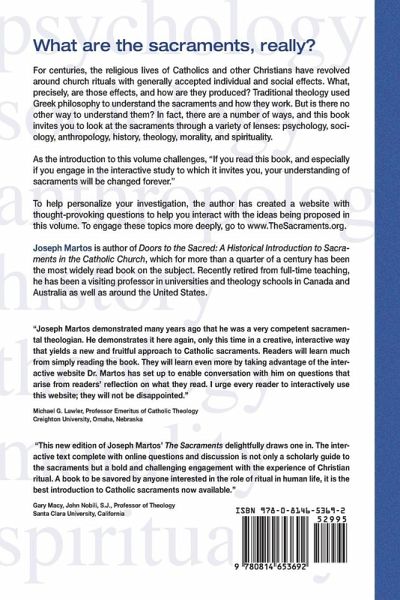 What are the sacraments, really? For centuries, the religious lives of Catholics and other Christians have revolved around church rituals with generally accepted individual and social effects. What, precisely, are those effects, and how are they produced? Traditional theology used Greek philosophy to understand the sacraments and how they work. But is there no other way to understand them? In fact, there are a number of ways, and this book invites you to look at the sacraments through a variety of lenses: psychology, sociology, anthropology, history, theology, morality, and spirituality. As the introduction to this volume challenges, If you read this book, and especially if you engage in the interactive study to which it invites you, your understanding of sacraments will be changed forever. To help personalize your investigation, the author has created a web site with thought-provoking questions that encourage you to interact with the ideas being proposed in this volume. To engage these topics more deeply, see www.TheSacraments.org. Joseph Martos is author of Doors to the Sacred: A Historical Introduction to Sacraments in the Catholic Church, which for more than a quarter of a century has been the most widely read book on the subject. Recently retired from full-time teaching, he has been a visiting professor in universities and theology schools in Canada and Australia as well as around the United States.