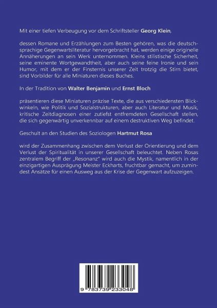 Für alle Fans von Georg Klein!Als Verbeugung vor dem großen deutschen, mehrfach preisgekrönten Schriftsteller Georg Klein erscheinen zu dessen siebzigstem Geburtstag diese stilistisch brillanten Miniaturen.Für alle, die ihren kritischen Blick auf unsere Gesellschaft vertiefen wollen!Aus einer reichen Kenntnis philosophischer, psychologischer und soziologischer Literatur wird ein ebenso kritischer wie ironischer Blick auf die Lage der Gesellschaft und deren Zeitgeist geworfen. Der Autor ist ein präziser Beobachter unscheinbarer aber folgenreicher Veränderungen. Er schaut etwa in die Möbelkataloge, wo keine Bücher mehr in den Regalen, dafür aber Fahrräder in der Küche stehen, oder auf die Verdrängung der Fußgängerinnen und Fußgänger aus den gentrifizierten Quartieren, die zum Laufen ein Fitnessstudio aufsuchen müssen. Und was hat es zu bedeuten, dass die Scheinwerfer der Autos von einst runden offenen Augen zu paranoiden Sehschlitzen verengt sind?Für alle, die eine nicht-konfessionelle Spiritualität suchen!Schließlich wird die inzwischen wohl von den meisten geteilte Erkenntnis, dass die Menschheit heute an einem existentiellen Scheidewege steht, auf die historischen Ursachen befragt. Dabei geht es nicht nur um die brutale Ungerechtigkeit der Gesellschaften im Ganzen, sondern ebenso um den Verlust der Spiritualität und die emotionalen und seelischen Folgen, die jede und jeden von uns betreffen.