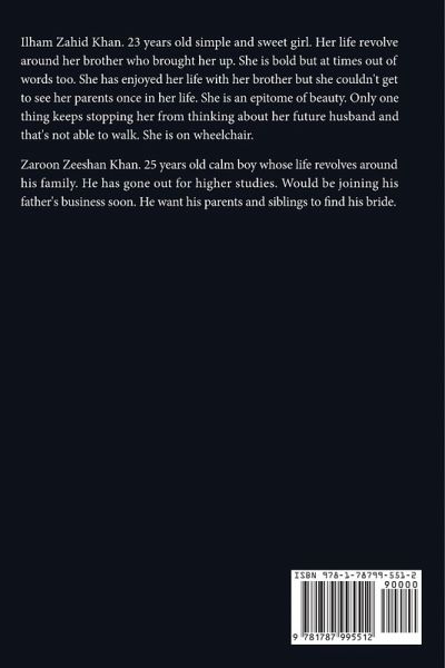 Ilham Zahid Khan. 23 years old simple and sweet girl. Her life revolve around her brother who brought her up. She is bold but at times out of words too. She has enjoyed her life with her brother but she couldn't get to see her parents once in her life. She is an epitome of beauty. Only one thing keeps stopping her from thinking about her future husband and that's not able to walk. She is on wheelchair. Zaroon Zeeshan Khan. 25 years old calm boy whose life revolves around his family. He has gone out for higher studies. Would be joining his father's business soon. He want his parents and siblings to find his bride.