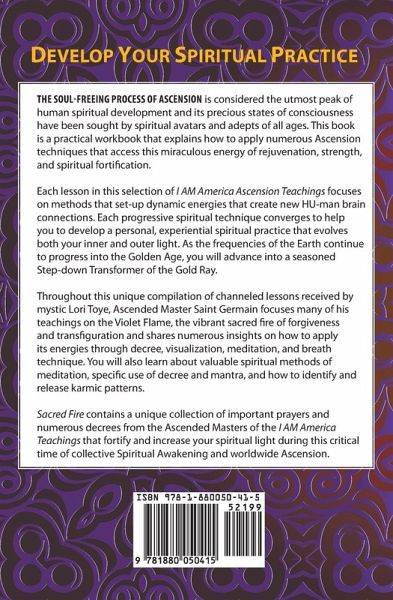 The soul-freeing process of Ascension is considered the utmost peak of human spiritual development and its precious states of consciousness have been sought by spiritual avatars and adepts of all ages. This book is a practical workbook that explains how to apply numerous Ascension techniques that access this miraculous energy of rejuvenation, strength, and spiritual fortification. Each lesson in this selection of I AM America Ascension Teachings focuses on methods that set-up dynamic energies that create new HU-man brain connections. Each progressive spiritual technique converges to help you to develop a personal, experiential spiritual practice that evolves both your inner and outer light. As the frequencies of the Earth continue to progress into the Golden Age, you will advance into a seasoned Step-down Transformer of the Gold Ray. Throughout this unique compilation of channeled lessons received by mystic Lori Toye, Ascended Master Saint Germain focuses many of his teachings on the Violet Flame, the vibrant sacred fire of forgiveness and transfiguration and shares numerous insights on how to apply its energies through decree, visualization, meditation, and breath technique. You will also learn about valuable spiritual methods of meditation, specific use of decree and mantra, and how to identify and release karmic patterns. Sacred Fire contains a unique collection of important prayers and numerous decrees from the Ascended Masters of the I AM America Teachings that fortify and increase your spiritual light during this critical time of collective Spiritual Awakening and worldwide Ascension.