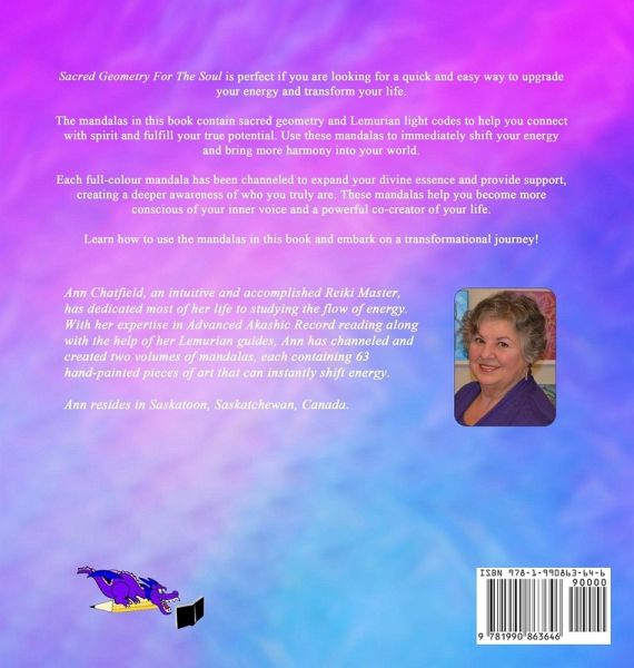 Sacred Geometry For The Soul is perfect if you are looking for a quick and easy way to upgrade your energy and transform your life. The mandalas in this book contain sacred geometry and Lemurian light codes to help you connect with spirit and fulfill your true potential. Use these mandalas to immediately shift your energy and bring more harmony into your world. Each full-colour mandala has been channeled to expand your divine essence and provide support, creating a deeper awareness of who you truly are. These mandalas help you become more conscious of your inner voice and a powerful co-creator of your life. Bring this book home with you and have the mandalas support you in creating the life you truly want. Ann Chatfield, an intuitive and accomplished Reiki Master, has dedicated most of her life to studying the flow of energy. With her expertise in Advanced Akashic Record reading along with the help of her Lemurian guides, Ann has channeled and created two volumes of mandalas, each containing 63 hand-painted pieces of art that can instantly shift energy. (Ann resides in Saskatoon, Saskatchewan, Canada.) A collection of 63 full-color mandalas with corresponding meditations to help shift your energy and provide fast and easy self-care, alignment of body-mind-spirit, and support to manifest your best life.