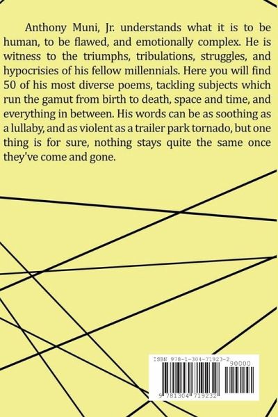 Anthony Muni, Jr. understands what it is to be human, to be flawed, and emotionally complex. He is witness to the triumphs, tribulations, struggles, and hypocrisies of his fellow millennials. Here you will find 50 of his most diverse poems, tackling subjects which run the gamut from birth to death, space and time, and everything in between. His words can be as soothing as a lullaby, and as violent as a trailer park tornado, but one thing is for sure, nothing stays quite the same once they've come and gone.