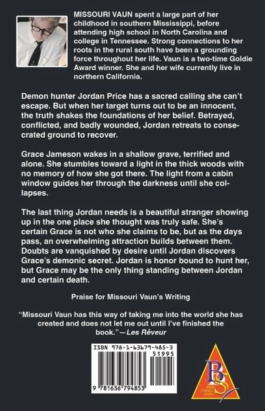 Demon hunter Jordan Price has a sacred calling she can't escape. But when her target turns out to be an innocent, the truth shakes the foundations of her belief. Betrayed, conflicted, and badly wounded, Jordan retreats to consecrated ground to recover. Grace Jameson wakes in a shallow grave, terrified and alone. She stumbles toward a light in the thick woods with no memory of how she got there. The light from a cabin window guides her through the darkness until she collapses. The last thing Jordan needs is a beautiful stranger showing up in the one place she thought was truly safe. She's certain Grace is not who she claims to be, but as the days pass, an overwhelming attraction builds between them. Doubts are vanquished by desire until Jordan discovers Grace's demonic secret. Jordan is honor bound to hunt her, but Grace may be the only thing standing between Jordan and certain death.