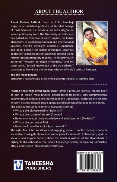 "Sacred Knowledge of the Upanishads" offers a profound journey into the heart of one of India's most revered philosophical traditions. This comprehensive volume delves deep into the teachings of the Upanishads, exploring the timeless wisdom that has shaped India's spiritual and intellectual heritage for millennia. The book addresses fundamental questions such as: ¿ What is the ultimate reality (Brahman)? ¿ What is the nature of the self (Atman)? ¿ How can one attain true knowledge and enlightenment (Moksha)? ¿ What is the purpose of life? ¿ How should one live ethically in the world? Through clear interpretations and engaging prose, complex concepts become accessible, making this book an essential guide for students of philosophy, spiritual seekers, and anyone curious about the timeless wisdom of the Upanishads. It highlights the richness of the Indian knowledge system, integrating spirituality, ethics, and science into a holistic worldview.