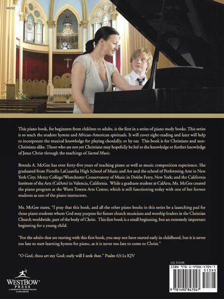 This piano book, for beginners from children to adults, is the first in a series of piano study books. This series is to teach the student hymns and African-American spirituals. It will cover sight-reading and later will help to incorporate the musical knowledge for playing chordally, or by ear. This book is for Christians and non-Christians alike. Those who are not yet Christians may hopefully be led to the knowledge or further knowledge of Jesus Christ through the teachings of Sacred Music. Brenda A. McGee has over forty-five years of teaching piano as well as music composition experience. She graduated from Fiorello LaGuardia High School of Music and Art and the school of Performing Arts in New York City; Mercy College/Westchester Conservatory of Music in Dobbs Ferry, New York; and the California Institute of the Arts (CalArts) in Valencia, California. While a graduate student at CalArts, Ms. McGee created the piano program at the Watts Towers Arts Center, which is still functioning today with one of her former students as one of the piano instructors. Ms. McGee states, "I pray that this book, and all the other piano books in this series be a launching pad for those piano students whom God may purpose for future church musicians and worship leaders in the Christian Church worldwide, part of the body of Christ. This first book is a small beginning, but an extremely important beginning for a young child. "For the adults that are starting with this first book, you may not have started early in childhood, but it is never too late to start learning hymns for piano, as it is never too late to come to Christ." "O God, thou art my God; early will I seek thee." Psalm 63:1a KJV