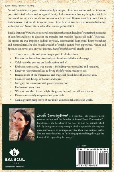 Sacred Possibilities is a powerful reminder of our true nature and our immense potential as individuals and as a global family. It demonstrates that anything is possible in our world for us, when we choose to trust our hearts and liberate ourselves of fears. It invites us to experience the immense power of our heart desires, of love and of sacred relationship with Spirit and Nature (invaluable allies on our paths). Lucille DancingWind shares personal experiences that span decades of shattering boundaries of comfort and logic, to discover the miracles that manifest ‘against all odds’. These real life stories are awe-inspiring, radical, mystical, controversial, humorous, heart-wrenching and extraordinary. She also reveals a wealth of insights gained from experience, Nature and Spirit, to empower us on our journeys. Sacred Possibilities will enable you to: • Trust yourself, life and your unique path in all situations. • Harness the boundless power of your intuitive abilities and energy. • Celebrate who you are on Earth, quirks and all. • Embrace your sacred, true nature – including your sensuality and sexuality. • Discover your personal key to living the life you’re meant to live. • Receive more of the miraculous possibilities that await you. • Connect with beings of Nature and Spirit. • Navigate the unknown with greater confidence. • Understand your fears. • Witness how the Divine delights in giving beyond our wildest dreams. • Know you are fully supported on your path. • Gain a greater perspective of our multi-dimensional, conscious world.