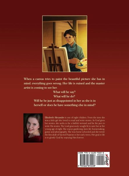 When a canvas tries to paint the beautiful picture she has in mind, everything goes wrong. Her life is ruined and the master artist is coming to see her. What will he say? What will he do? Will he be just as disappointed in her as she is in herself or does he have something else in mind? Elizabeth Alexander is one of eight children. From the time she was a little girl she loved to read and write stories. As God gives her stories, she seeks to be a faithful steward and be the pen to write His stories. The Lord graciously sought fit to save her at the young age of eight. She enjoys gardening, farm life, homemaking, guitar and photography. She was home schooled and she wrote the first draft of Sacred Purpose in her early teens. Her goal in life is to glorify God by enjoying Him forever.