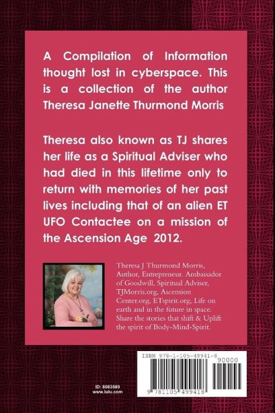 The Memoirs and articles of a spiritual adviser who had a near death experience, shares life of memories of past lives, and articles from paranormal Alien ET UFO websites. Theresa Morris is a well known psychic spiritual adviser of the Ascension Center of Hawaii and the Ascension Age of 2012 and Beyond. Author of 13 books to date. January, 2012. This information was thought to be lost and became the Ascension Cosmology of the times called Ascension Age the Golden Age of Cosmology now known as the Sacred Secret of the Ancient Mystery Schools of the Metaphysical Schools of the Lightworkers and the Truthseekers. Theresa Janette Thurmond Born December 27, 1951 and again January 27, 1974 after dying giving birth to her daughter who is now also a Spiritual Adviser of the Ascension Age to being 12-21-12.