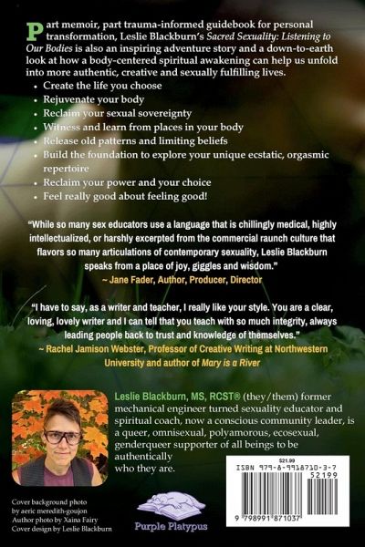 Part memoir, part trauma-informed guidebook for personal transformation, Leslie Blackburn's Sacred Sexuality: Listening to Our Bodies is also an inspiring adventure story and a down-to-earth look at how a body-centered spiritual awakening can help us unfold into more authentic, creative and sexually fulfilling lives. Create the life you choose Rejuvenate your body Reclaim your sexual sovereignty Witness and learn from places in your body Release old patterns and limiting beliefs Build the foundation to explore your unique ecstatic, orgasmic repertoire Reclaim your power and your choice Feel really good about feeling good!
