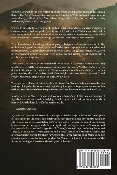 Dive into the mystical world of traditional smoke rituals with "Sacred Smoke and Mountain Spirits: The Art of Appalachian Incense and Smudging," penned by Ivy Mae, known for her profound connection to Appalachian folklore and traditions. This comprehensive guide explores the ancient art of smoke magic, deeply rooted in the spiritual landscape of the Appalachian region. Each chapter delves into the spiritual significance of smoke, from its use as a purifying agent to its role in communicating with the spirit world, offering readers a well-rounded understanding of its historical and cultural importance. Learn the ethical ways to harvest and use herbs, resins, and woods, and discover how to create your own incense blends and smudge sticks tailored to various magical needs. Ivy Mae equips you with detailed smudging spells and rituals, each designed to enhance your magical practice, whether for protection, healing, or spiritual communication. From crafting incense for the changing seasons to developing rituals for smudging homes and sacred spaces, each activity is presented with clear, step-by-step instructions to ensure effectiveness and intent. Join the journey with "Sacred Smoke and Mountain Spirits" to:Master the art of Appalachian smoke magic and learn the intricate use of incense and smudging in your rituals. Align your practices with the natural energies of the land, using ethically sourced materials to maintain harmony with the environment. Explore a wealth of nocturnal practices that draw upon the rich Appalachian traditions, connecting deeply with the spiritual wisdom they offer. Embark on a transformative path with comprehensive guidance for each ritual, including:Ritual/Spell Introduction: Understand the deeper intentions behind each practice. Materials Needed: Gather the necessary herbs, resins, and tools for effective rituals. Preparation: Tips on preparing your space and yourself for the sacred work. Location and Timing: Optimal settings and timings to enhance the potency of your rituals. Step-by-Step Procedure: Detailed instructions to guide you through each ritual or spell. Aftercare: Ensuring the energy work is sealed and the space is properly closed. Notes and Variations: Additional insights and adaptations for personalizing your practices. "Sacred Smoke and Mountain Spirits" is not just a book; it is a gateway to reviving and integrating the age-old wisdom of Appalachian smoke magic into modern practices, allowing you to weave powerful magic with confidence and respect for the traditions that have long nurtured the bond between nature and mankind.