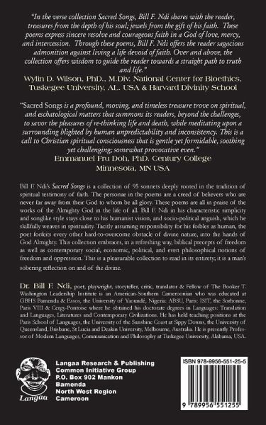 Bill F. Ndi's Sacred Songs is a collection of 95 sonnets deeply rooted in the tradition of spiritual testimony of faith. The personae in the poems are a creed of believers who are never far away from their God to whom be all glory. These poems are all in praise of the works of the Almighty God in the life of all. Bill F. Ndi in his characteristic simplicity and songlike style stays close to his humanist vision, and socio-political anguish, which he skillfully weaves in spirituality. Tacitly assuming responsibility for his foibles as human, the poet forfeits every other hard-to-overcome obstacle of divine nature, into the hands of God Almighty. This collection embraces, in a refreshing way, biblical precepts of freedom as well as contemporary social, economic, political, and even philosophical notions of freedom and oppression. This is a pleasurable collection to read in its entirety; it is a man's sobering reflection on and of the divine.