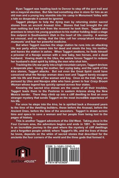 Ryan Taggert was heading back to Denver to step off the gun trail and win a mayoral election. But fate had something else in store for him as an old man and a young boy stumble into his camp in Monument Valley with a tale so desperate it cannot be ignored. Taggert pledges to help the dying man by returning stolen sacred stones from an ancient Anasazi kiva. Stones that had brought the old man nothing but bad luck from the moment he took them. Taggert also promises to return his young grandson to his mother holding down a stage line outpost in Southeastern Utah in the heart of Ute country. A woman so unusual, and so daring, that the Utes call her unoop'ekunt kookwup' mumowts' and fear her powerful medicine. But when Taggert reaches the stage station he runs into an attacking Ute war party which leaves him for dead and steals the boy, his mother, and leaves the station in ashes. When Taggert awakens, he finds himself a prisoner of a Navajo woman with a new baby, two horses, and a dead husband. Vowing death to the Utes, the widow forces Taggert to redeem her husband's dead spirit by killing the men who shot him. Tracking the Ute war party into a high mountain canyon, Taggert devises a desperate plan. Using the mother, her crying baby, and the spirit of the kiva stones, Taggert attacks. But not even the Great Spirit could have conceived what the Navajo woman does next and Taggert barely escapes with his life and those of the woman and boy. Once on the trail, they are pursued by Utes and Navajos alike who have grown to fear Crazy Broom Woman whose legend has quickly spread across four states. Knowing the sacred kiva stones are the cause of all their troubles, Taggert leads them to the Pastoras in eastern Arizona along the New Mexico border. There they climb up into a cliff dwelling to find an even stranger mystery that sends Taggert on the most incredible experience of his life. For once he steps into the kiva, he is spirited back a thousand years to the time of the dwelling builders, those before the Anasazi, before the Ancient Ones, before the time of the ancestors. Taggert is drawn across time and space to save a woman and her people from being lost to the pages of history. This is another Taggert adventure of the Old West. Taking place in the Four Corners area, the adventure begins and ends in 1891. In between is an incredible journey to the past where the mystery of cliff dwellings and a forgotten people unfold; where Taggert's life, and the lives of those he loves, depends on the whim of sacred stones that described for the ancients the four corners of the world and the three gods that formed it.