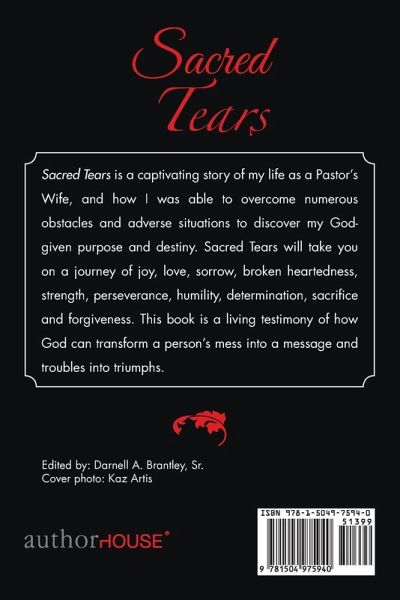 Sacred Tears is a captivating story of my life as a Pastor's Wife, and how I was able to overcome numerous obstacles and adverse situations to discover my God-given purpose and destiny. Sacred Tears will take you on a journey of joy, love, sorrow, broken heartedness, strength, perseverance, humility, determination, sacrifice and forgiveness. This book is a living testimony of how God can transform a person's mess into a message and troubles into triumphs.