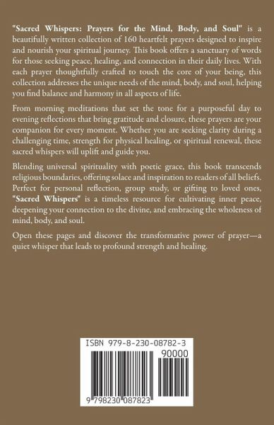 "Sacred Whispers: Prayers for the Mind, Body, and Soul" is a beautifully written collection of 160 heartfelt prayers designed to inspire and nourish your spiritual journey. This book offers a sanctuary of words for those seeking peace, healing, and connection in their daily lives. With each prayer thoughtfully crafted to touch the core of your being, this collection addresses the unique needs of the mind, body, and soul, helping you find balance and harmony in all aspects of life. From morning meditations that set the tone for a purposeful day to evening reflections that bring gratitude and closure, these prayers are your companion for every moment. Whether you are seeking clarity during a challenging time, strength for physical healing, or spiritual renewal, these sacred whispers will uplift and guide you. Blending universal spirituality with poetic grace, this book transcends religious boundaries, offering solace and inspiration to readers of all beliefs. Perfect for personal reflection, group study, or gifting to loved ones, "Sacred Whispers" is a timeless resource for cultivating inner peace, deepening your connection to the divine, and embracing the wholeness of mind, body, and soul. Open these pages and discover the transformative power of prayer-a quiet whisper that leads to profound strength and healing.