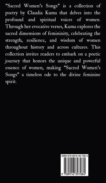 "Sacred Women's Songs" is a collection of poetry by Claudia Kuma that delves into the profound and spiritual voices of women. Through her evocative verses, Kuma explores the sacred dimensions of femininity, celebrating the strength, resilience, and wisdom of women throughout history and across cultures. This collection invites readers to embark on a poetic journey that honors the unique and powerful essence of women, making "Sacred Women's Songs" a timeless ode to the divine feminine spirit. Copyright © 2024 Book Fairy Publishing