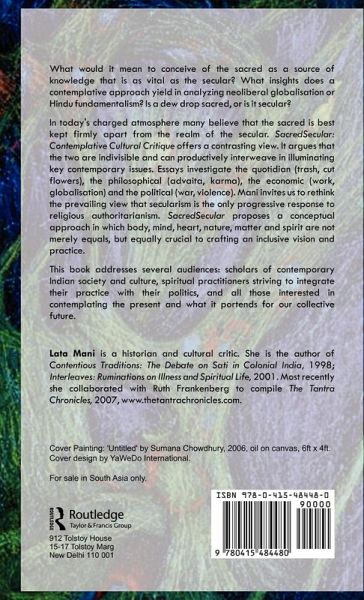 What would it mean to conceive of the sacred as a source of knowledge that is as vital as the secular? What insights does a contemplative approach yield in analysing neoliberal globalisation or Hindu fundamentalism? Is a dew drop sacred, or is it secular? In today's charged atmosphere many believe that the sacred is best kept firmly apart from the realm of the secular. SacredSecular: Contemplative Cultural Critique offers a contrasting view. It argues that the two are indivisible and can productively interweave in illuminating key contemporary issues. Essays investigate the quotidian (trash, cut flowers), the philosophical (advaita, karma), the economic (work, globalisation) and the political (war, violence). Mani invites us to rethink the prevailing view that secularism is the only progressive response to religious authoritarianism. SacredSecular proposes a conceptual approach in which body, mind, heart, nature, matter and spirit are not merely equals, but equally crucial to crafting an inclusive vision and practice. This book addresses several audiences: scholars of contemporary Indian society and culture, spiritual practitioners striving to integrate their practice with their politics, and all those interested in contemplating the present and what it portends for our collective future.
