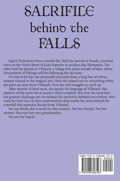Ingrid Torfudottir lives a double life. Half she spends in Runde, a normal town on the North Shore of Lake Superior in modern day Minnesota. The other half she spends in Villmark, a village that exists outside of time, where descendants of Vikings still live following the old ways. On top of all that, she personally descends from a long line of volvas, women trained in the magical arts. Only she missed out on everything when she grew up away from Villmark. Now she still struggles to catch up. After months of hard work, she speaks the language of Villmark. Her mastery of the runes sits at nearly a third complete. But now she must face her greatest challenge yet: the woman she narrowly defeated once before, who waits for their face-to-face confrontation deep inside the caves behind the waterfall that separates Runde from Villmark. No one thinks she is ready for this rematch. Not her friends. Not her mentor. Not even her own grandmother. No one but Ingrid. Sacrifice Behind the Falls is book 9 in the ongoing Viking Witch Cozy Mystery series!