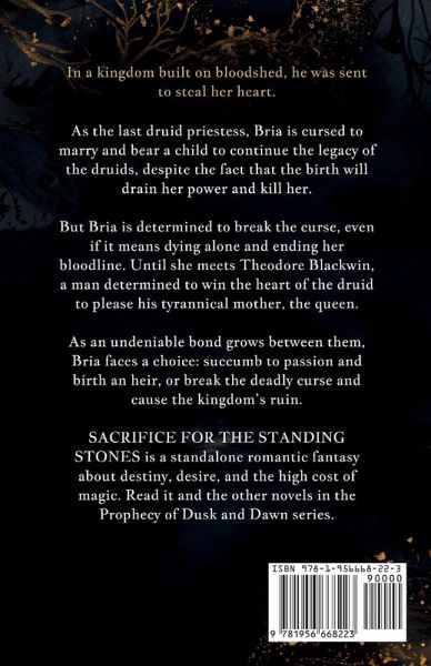 In a kingdom built on bloodshed, he was sent to steal her heart. As the last druid priestess, Bria is cursed to marry and bear a child to continue the legacy of the druids, despite the fact that the birth will drain her power and kill her. But Bria is determined to break the curse, even if it means dying alone and ending her bloodline. Until she meets Theodore Blackwin, a man determined to win the heart of the druid to please his tyrannical mother, the queen. As an undeniable bond grows between them, Bria faces a choice: succumb to passion and birth an heir, or break the deadly curse and cause the kingdom's ruin. SACRIFICE FOR THE STANDING STONES is a romantic fantasy about destiny, desire, and the high cost of magic. Pick up this standalone novel in the Prophecy of Dusk and Dawn series today!