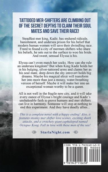 Tattooed mer-shifters are climbing out of the secret depths to claim their soul mates and save their race! Steadfast mer king, Kadir, has endured ridicule, banishment, and undersea prison for his belief that modern human women will save their dwindling race. Freed to found a city of mermen shifters who share his beliefs, he sets out to the surface to woo his bride. And sweet, sensual Elyssa is his.Elyssa can't even match her socks. How can she rule an undersea kingdom? But when King Kadir holds her in his bulging, silver-tattooed arms and claims her as his soul mate, deep down the shy introvert holds big dreams. Maybe his magical elixir will transform her into more than just a mousy, water-breathing version of herself. Maybe it will make her into an exceptional woman worthy to be a queen.All is not well in the fragile new city, and it will take every ounce of Elyssa's bright courage and Kadir's unshakeable faith to prove humans and mer shifters can live in harmony. Someone will stop at nothing to end this experiment. And they have deadly allies...This is a complete novel with a happy ending! Also, it features steamy mer shifter love scenes, exciting shark attacks, and a crotchety giant cephalopod named Octopus Kong. Fall in love with these men of the sea!