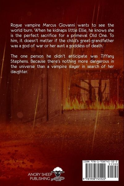 Rogue vampire Marcus Giovanni wants to see the world burn. When he kidnaps little Ellie, he knows she is the perfect sacrifice for a primeval Old One. To him, it doesn’t matter if the child’s great-grandfather was a god of war or her aunt a goddess of death. The one person he didn’t anticipate was Tiffany Stephens. Because there’s nothing more dangerous in the universe than a vampire slayer in search of her daughter.