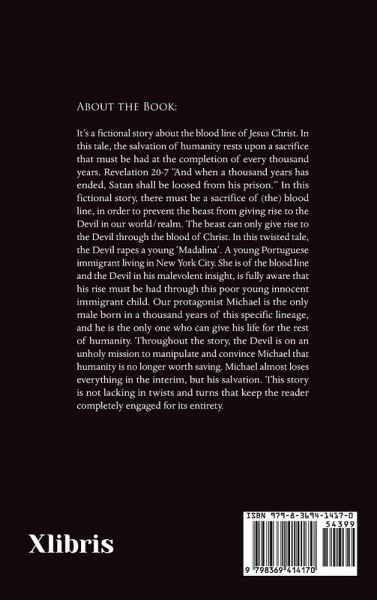About the Book: It's a fictional story about the blood line of Jesus Christ. In this tale, the salvation of humanity rests upon a sacrifice that must be had at the completion of every thousand years. Revelation 20-7 "And when a thousand years has ended, Satan shall be loosed from his prison." In this fictional story, there must be a sacrifice of (the) blood line, in order to prevent the beast from giving rise to the Devil in our world/realm. The beast can only give rise to the Devil through the blood of Christ. In this twisted tale, the Devil rapes a young 'Madalina'. A young Portuguese immigrant living in New York City. She is of the blood line and the Devil in his malevolent insight, is fully aware that his rise must be had through this poor young innocent immigrant child. Our protagonist Michael is the only male born in a thousand years of this specific lineage, and he is the only one who can give his life for the rest of humanity. Throughout the story, the Devil is on an unholy mission to manipulate and convince Michael that humanity is no longer worth saving. Michael almost loses everything in the interim, but his salvation. This story is not lacking in twists and turns that keep the reader completely engaged for its entirety.