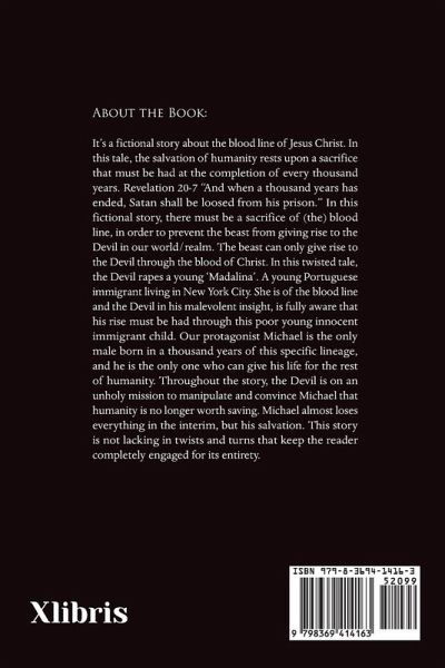 About the Book: It's a fictional story about the blood line of Jesus Christ. In this tale, the salvation of humanity rests upon a sacrifice that must be had at the completion of every thousand years. Revelation 20-7 "And when a thousand years has ended, Satan shall be loosed from his prison." In this fictional story, there must be a sacrifice of (the) blood line, in order to prevent the beast from giving rise to the Devil in our world/realm. The beast can only give rise to the Devil through the blood of Christ. In this twisted tale, the Devil rapes a young 'Madalina'. A young Portuguese immigrant living in New York City. She is of the blood line and the Devil in his malevolent insight, is fully aware that his rise must be had through this poor young innocent immigrant child. Our protagonist Michael is the only male born in a thousand years of this specific lineage, and he is the only one who can give his life for the rest of humanity. Throughout the story, the Devil is on an unholy mission to manipulate and convince Michael that humanity is no longer worth saving. Michael almost loses everything in the interim, but his salvation. This story is not lacking in twists and turns that keep the reader completely engaged for its entirety.