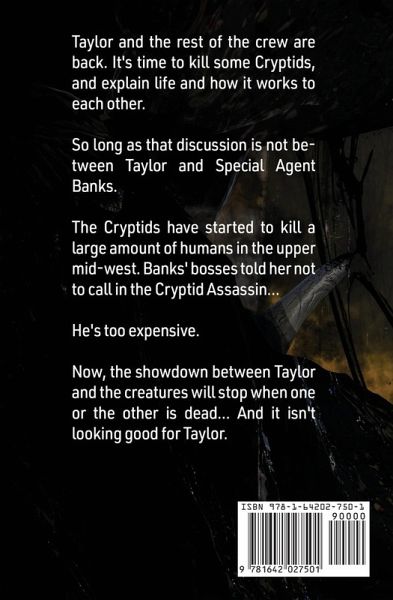 "Do you think he doesn't care about the hours he's putting in?" Vickie asked. "I get it," Bobby responded, clearly annoyed. "And I'm not saying Taylor doesn't care about the work. I'm only saying that...well, it's not like him to be late." Vickie shrugged and returned to her work. "The chances are he went to that breakfast place the two of you love so much." "It's called Il Fornaio, and it's not only a breakfast place," the mechanic replied and resumed his task. "Actually, the fact that they serve breakfast is incidental. They're an Italian place, so they serve Italian food for all three meals of the day. And a couple more meals too if you're a hobbit." "You're Korean, though, so why don't you go more for the Asian food?" "I'm Chinese-American, thank you very much," Bobby said. "And it's not a trait that defines who I am or what I eat. I happen to like me some authentic Italian food, so there." "Sorry, I didn't mean to offend you." She sounded genuine in her apology. "Still, your guys' obsession with that place is a little unhealthy, both for your bodies and your minds." "Hey, don't knock it until you try it," he snapped. "Head on over there for the breakfast special and you'll see what all the fuss is about." Vickie raised an eyebrow. "Breakfast special, huh? Is that what you older guys call Netflix and Chill?" Bungees turned away from his work again and looked at her with his eyes narrowed and a confused expression on his face. "Oh, come on," Vickie said, exasperated. "Don't tell me you don't know what Netflix and Chill is code for. It's been around since before I was born. People have used it for decades." "Not where I come from," the heavyset mechanic told. "Where is that," Vickie huffed, "the f#K#& Stone Ages?" Taylor and the rest of the crew are back. It's time to kill some Cryptids, and explain life and how it works to each other. So long as that discussion is not between Taylor and Special Agent Banks. The Cryptids have started to kill a large amount of humans in the upper mid-west. Banks' bosses told her not to call in the Cryptid Assassin... He's too expensive. Now, the showdown between Taylor and the creatures will stop when one or the other is dead... And it isn't looking good for Taylor. Go up and click 'Read for Free' or 'Buy Now' and find out the latest antics happening to Taylor McFadden... The Cryptid Assassin.