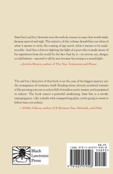 From his first appearance on the page, "we knew he was bound for something unsolvable." But a little thing like futility can't stop our hero from holding up a magnifying glass to a world "so bright it's impossible to understand." In this searching, provocative collection of coming-of-age sonnets, the sad boy detective listens close, collects the evidence, and reimagines the strange landscapes of a life, a body, a boy, a self. Through a questioning, fervent lens, sam sax's SAD BOY / DETECTIVE reminds us how deeply bizarre and at times undecipherable all this existence stuff truly is.
