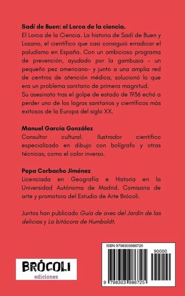 Sadí de Buen: el Lorca de la ciencia. Una historia de éxito científico frustrada por la represión. El Lorca de la Ciencia. La historia de Sadí de Buen y Lozano, el científico que casi consiguió erradicar el paludismo en España. Con un ambicioso programa de prevención, ayudado por la gambusia - un pequeño pez americano- y junto a una amplia red de centros de atención médica, solucionó lo que era un problema sanitario de primera magnitud. Su asesinato tras el golpe de estado de 1936 echó a perder uno de los logros sanitarios y científicos más exitosos de la Europa del siglo XX.