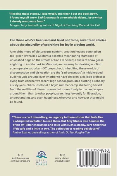 For those who've been sad and tried not to be, seventeen stories about the absurdity of searching for joy in a dying world. A neighborhood of picturesque content-creation houses perched on too-green lawns in a California desert; a meandering stampede of unleashed dogs on the streets of San Francisco; a skein of snow geese alighting in a state park in Missouri; an uncanny fundraising auction at an upscale suburban-DC prep school. Inhabiting these worlds of disconnection and dislocation are the "sad grownups": a middle-aged queer couple arguing over whether to have children, a college professor dying from cancer, two recent high school graduates plotting a robbery, a sixty-year-old counselor at a boys' summer camp sheltering herself from the realities of life-all connected more closely to the landscapes around them than to other people, searching fervently for liberation, understanding, and even happiness, wherever and however they might be found.
